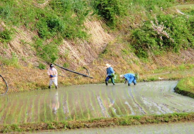 田植えが終わった田んぼでは、田植え機で植えられなかった場所を植え直しに勤しんでいます。