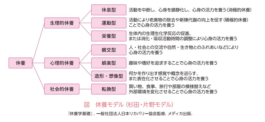 「休養7モデル」とは休養を生理的休養、心理的休養、社会的休養の大きく3つに分類をし、それぞれに該当する休養法をまとめたものになります。