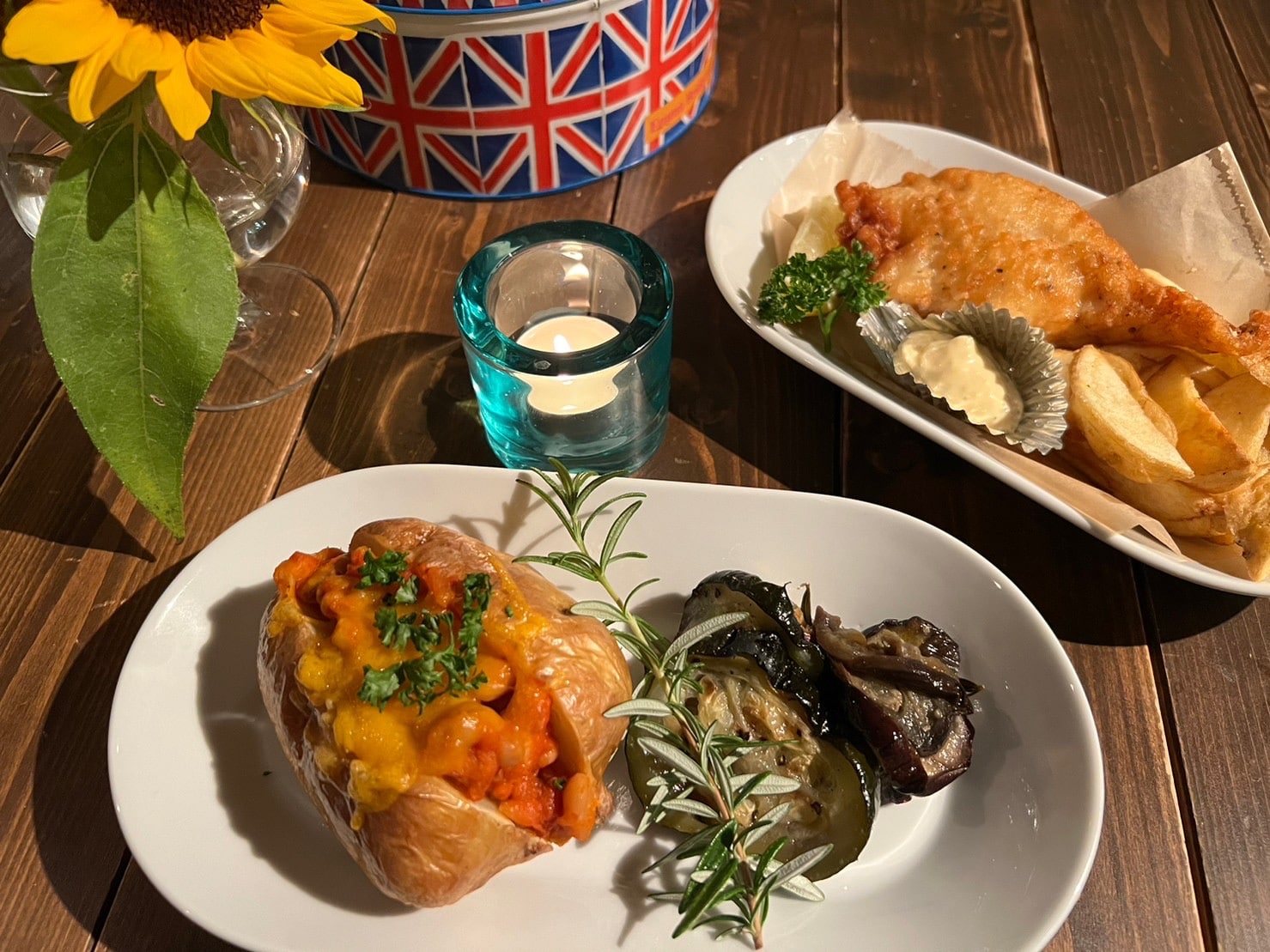 しほれっとのイングリッシュパブでは、定番のフィッシュ&チップス、ジャケットポテト、ソーセージ&マッシュなどを