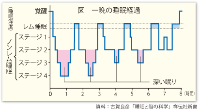 睡眠は眠りの深さによって「レム睡眠」と「ノンレム睡眠」に分けることができ、眠り始めるとまずは深いノンレム睡眠に入ります。