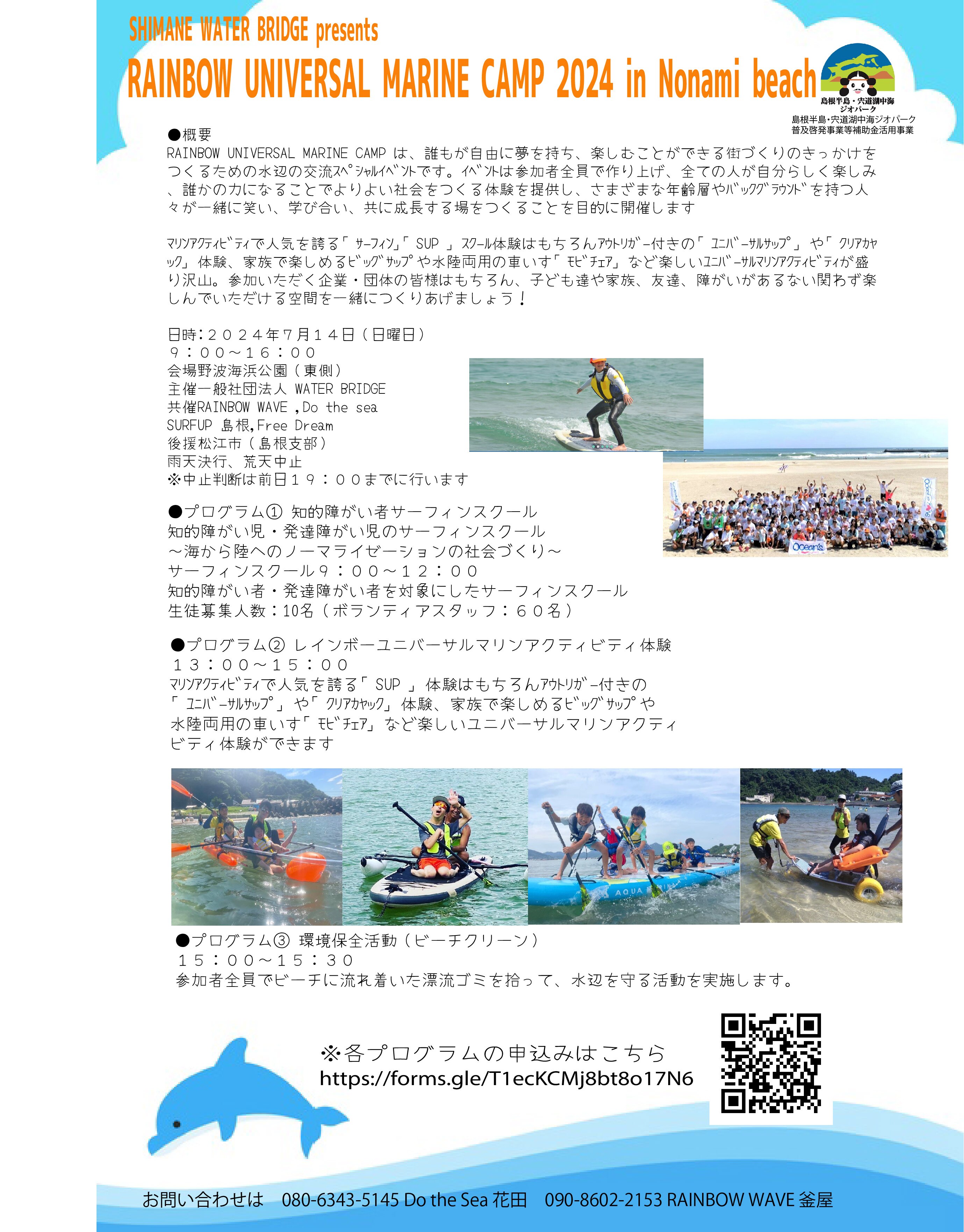 ①7/14(日):RAINBOW UNIVERSAL MARINE CAMP 2024 in Nonami beach