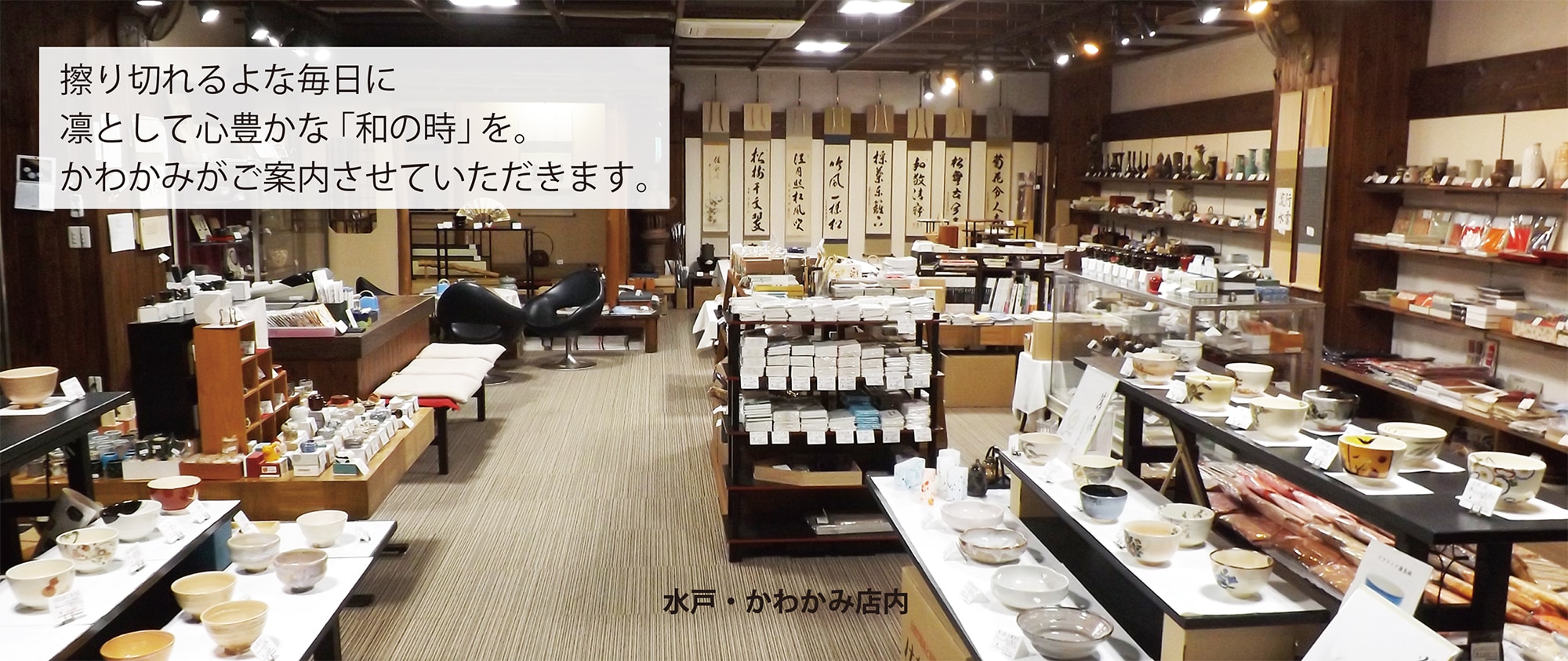 水戸大工町、昭和の雰囲気漂う飲食店街「みと楽横丁」の地下1階に店舗を構える茶道具専門店「かわかみ」。所狭しと様々な茶道具が並び、見ているだけでも楽しくなります。