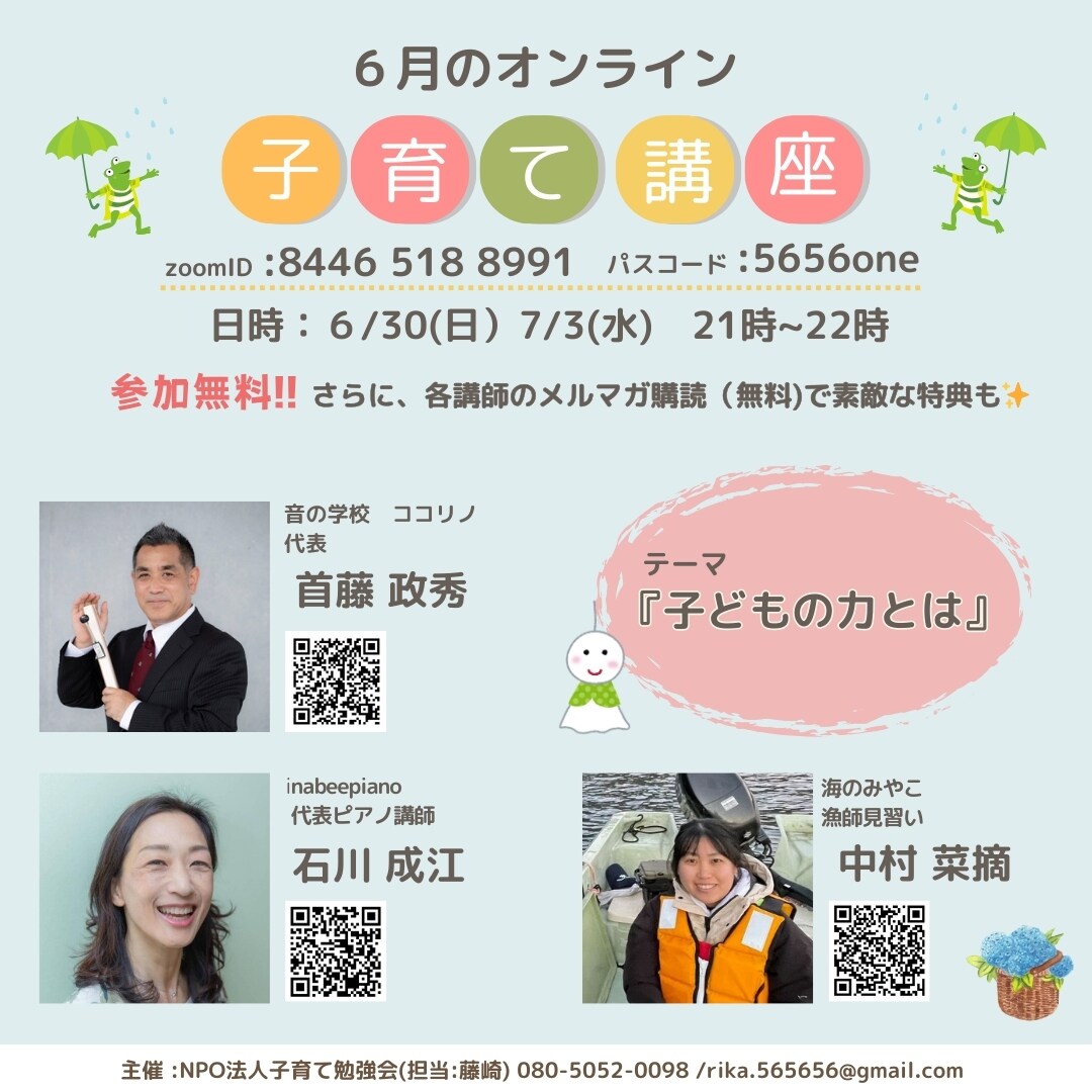 6月の子育てセミナー最終日30日となりましたが、素晴らしいラインアップの先生方を揃え、本日夜21時から開催させていただきます。