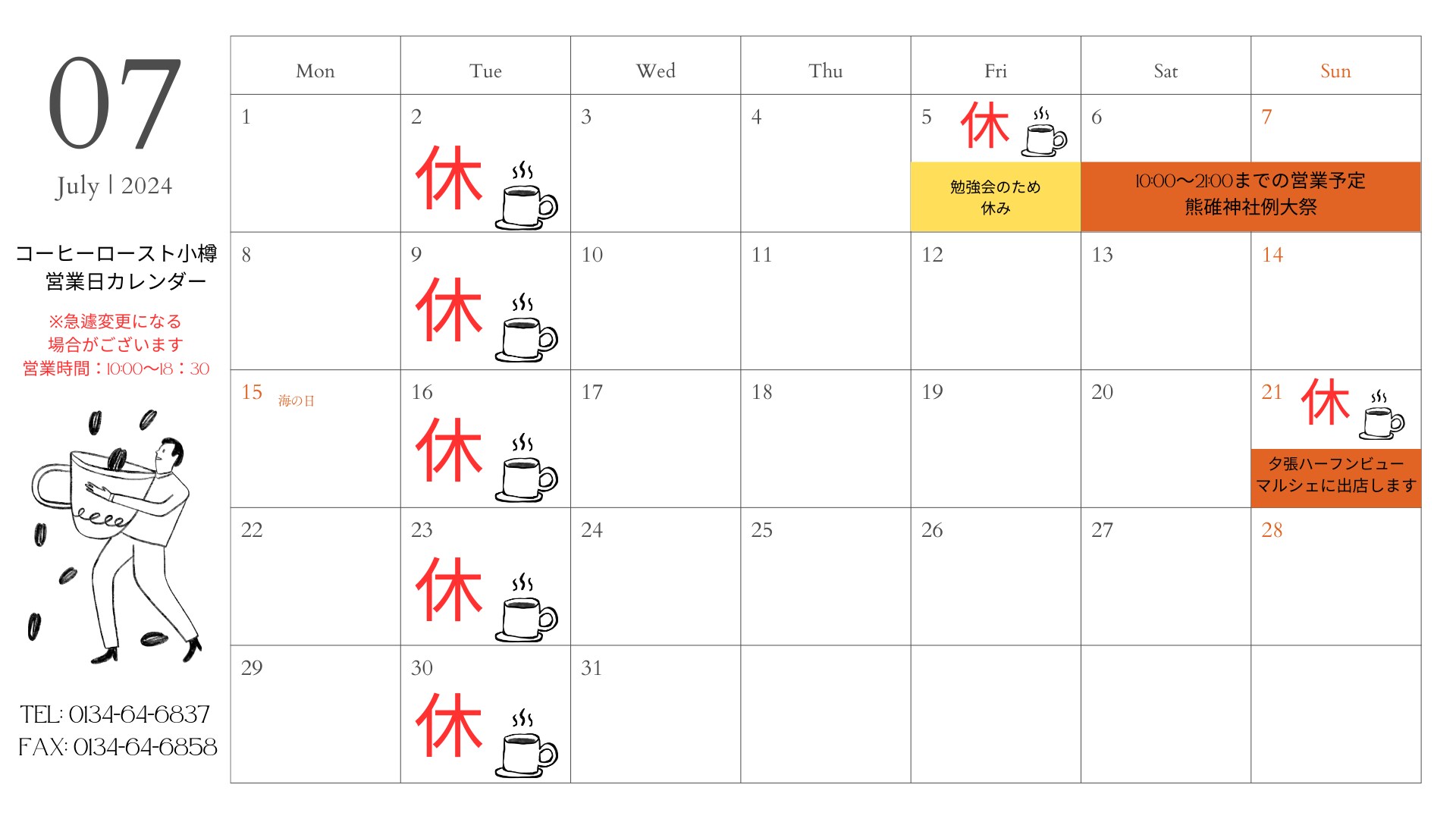コーヒーロースト小樽 ☆7月のお知らせ☆