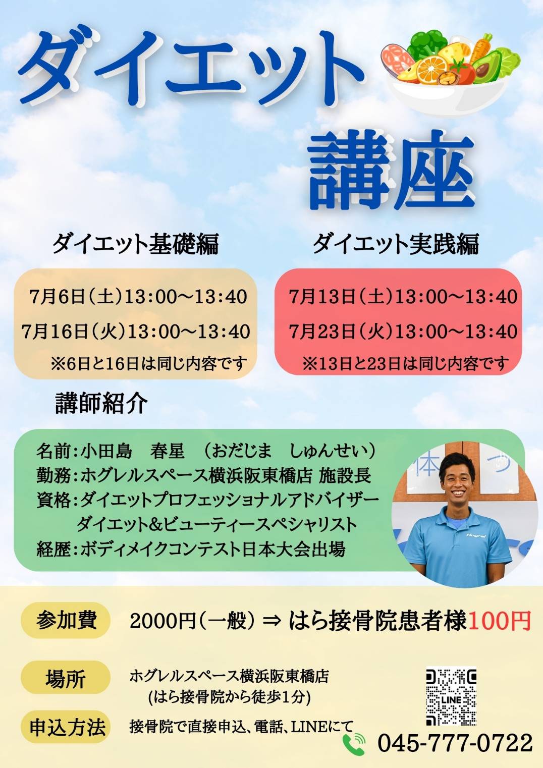 はら接骨院運動健康部門、ホグレルスペース横浜阪東橋店でダイエット講座を開催します。