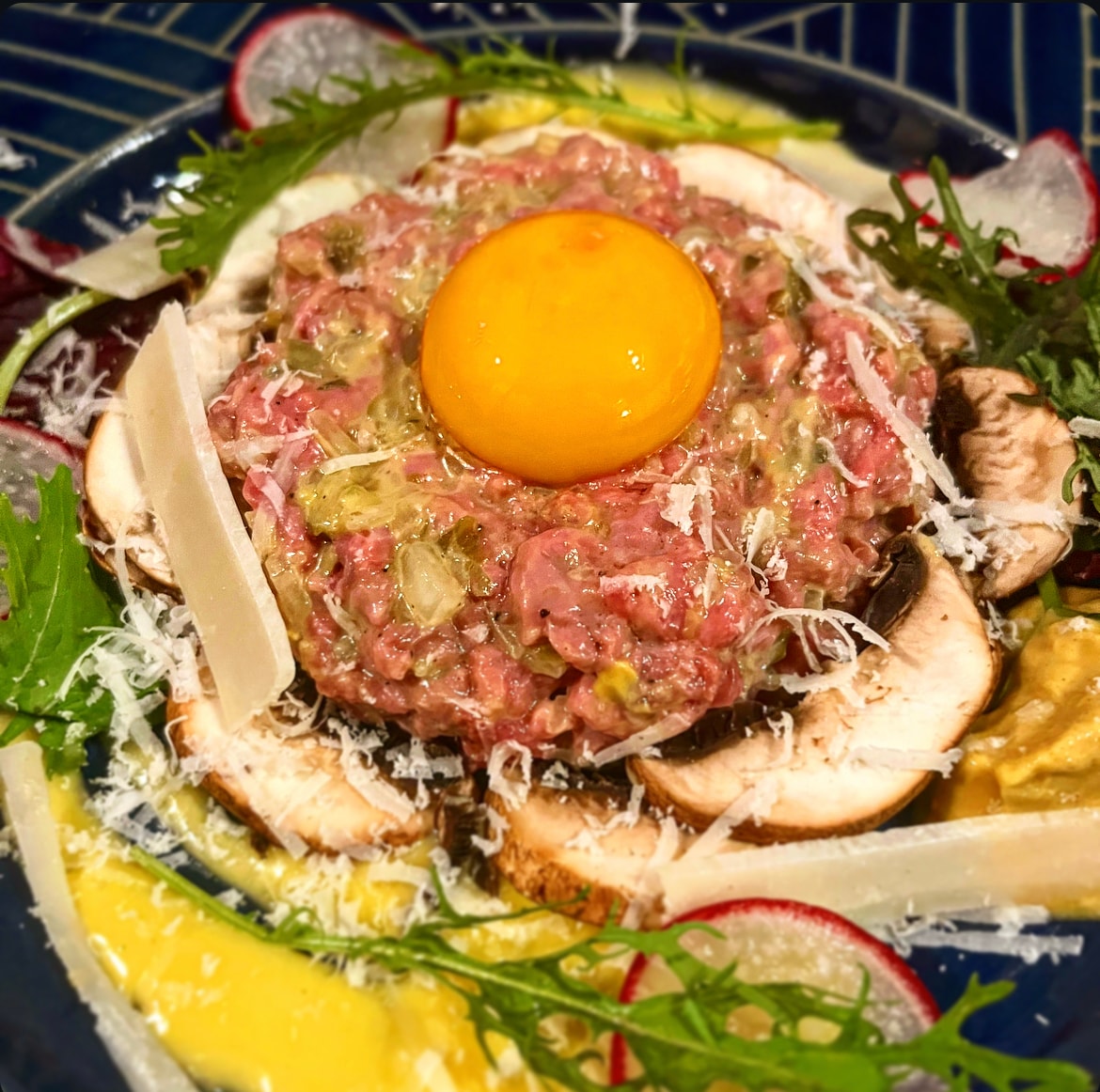 上の卵黄は中村園芸ファームさんのゆかり卵✨卵をくずしながら周りのお野菜やマッシュルームと混ぜてお召し上がり下さい♪グラスフェッドのお肉はあっさりとしながらも、噛めば力強い旨味が感じられます!