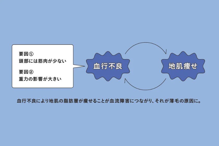 頭部面積のうち3分の2の面積を占める地肌は顔の皮膚と一続きであり、筋肉も繋がって互いに連動しています。地肌が血行不良を引き起こすと次第に硬くなりますが、その状態になると地肌には栄養も行き届かず、ハリ・弾力が失われ、顔や首のたるみの原因につながります。