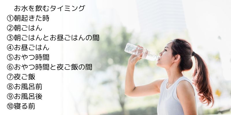 ①朝起きた時・②朝ごはん・③朝ごはんとお昼ごはんの間・④お昼ごはん・⑤おやつ時間・⑥おやつ時間と夜ご飯の間・⑦夜ご飯・⑧お風呂前・⑨お風呂後・⑩寝る前という風にすると全部で10回になりますので、コップ1杯を150mlだとこれだけで1日1500ml飲めますので十分な量が摂れます。