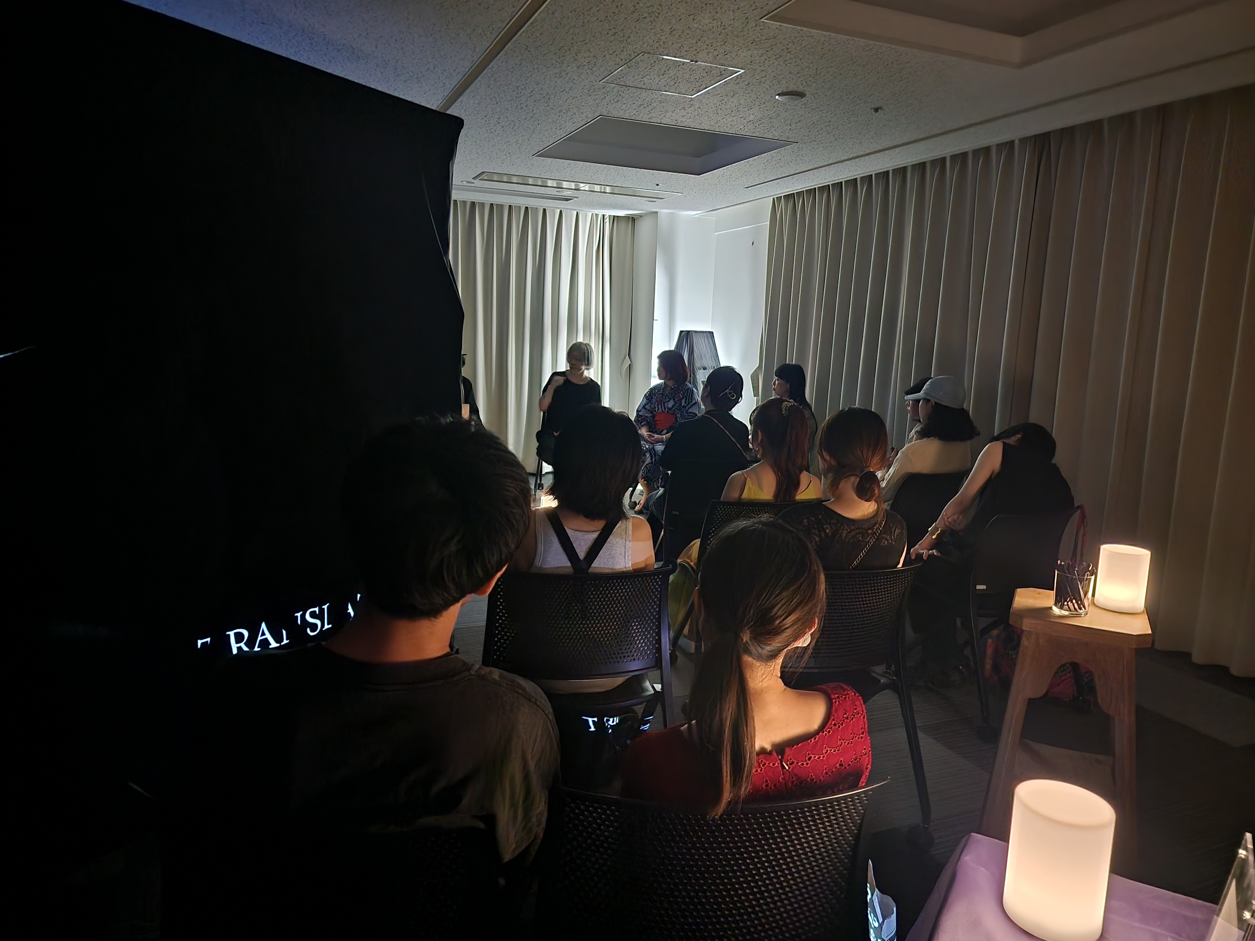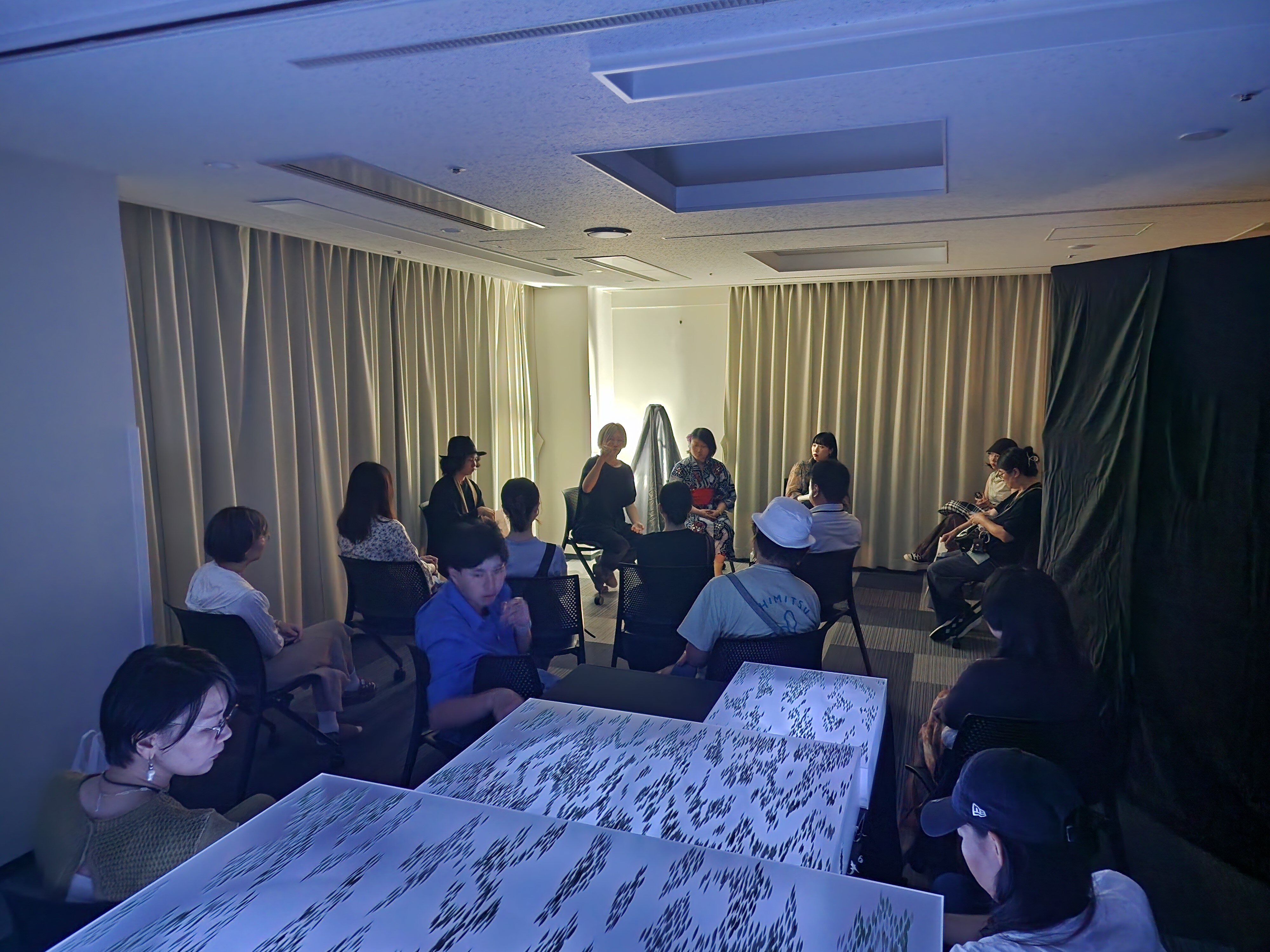 暗い照明の中でトークセッションしてます