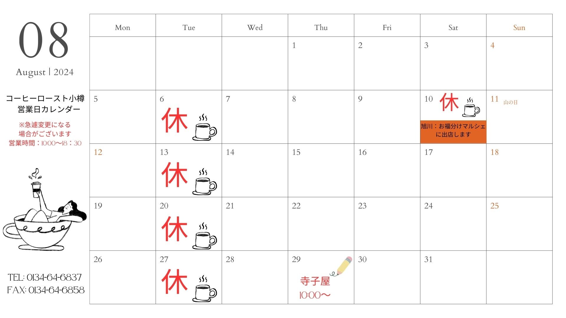 コーヒーロースト小樽 ☆8月のお知らせ☆