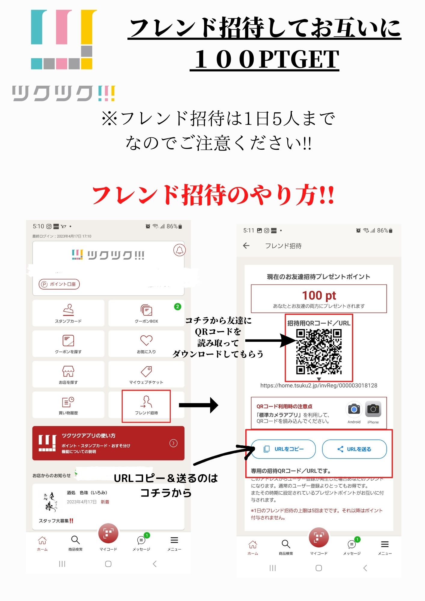 更に、ツクアプリでフレンド招待致しますと自分にも友達にもお互いに100PTずつもらえちゃいますよ^o^