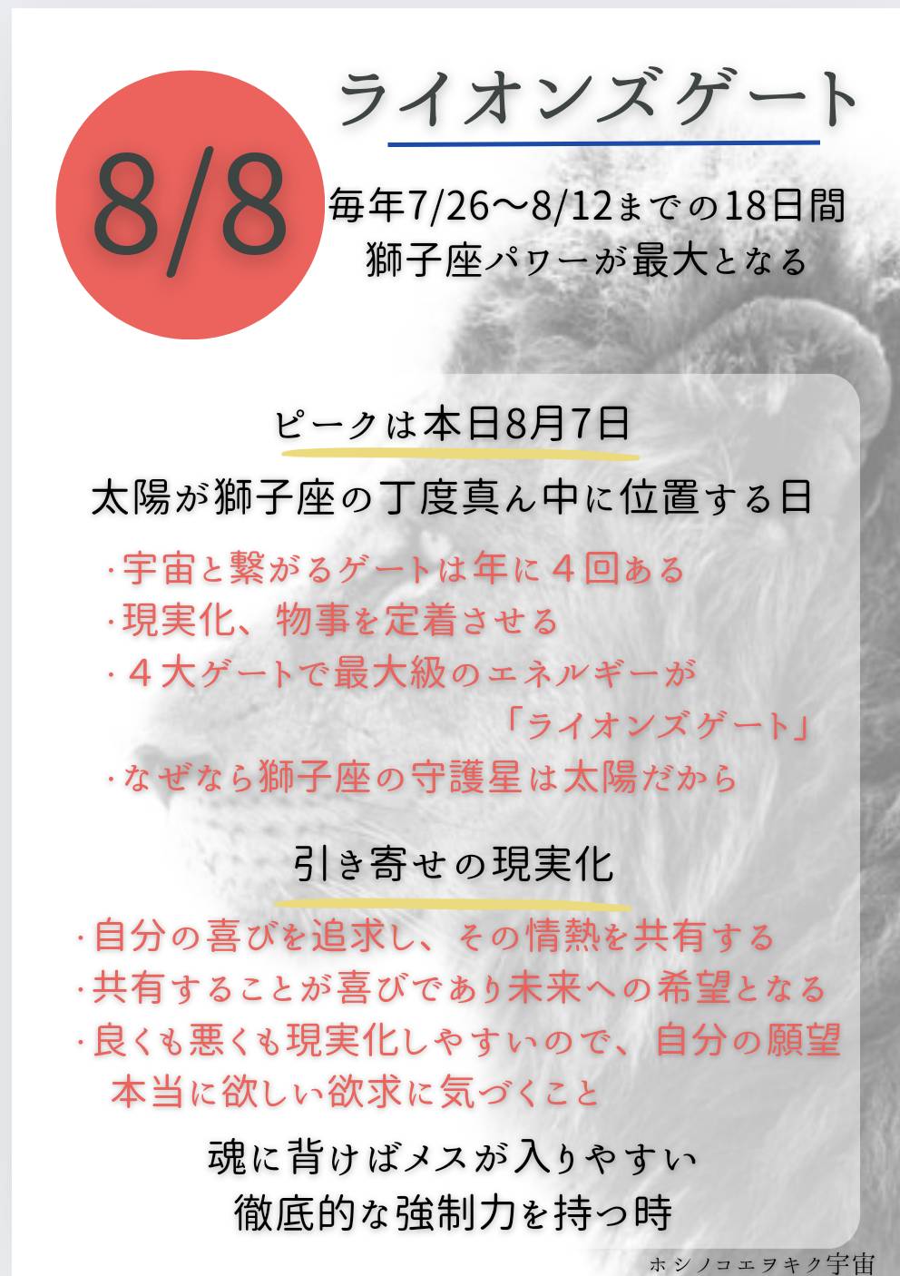 知ってる!ググった!という方も、このライオンズゲート全開の日は「明日8月8日」だと思っているのかもしれません💦