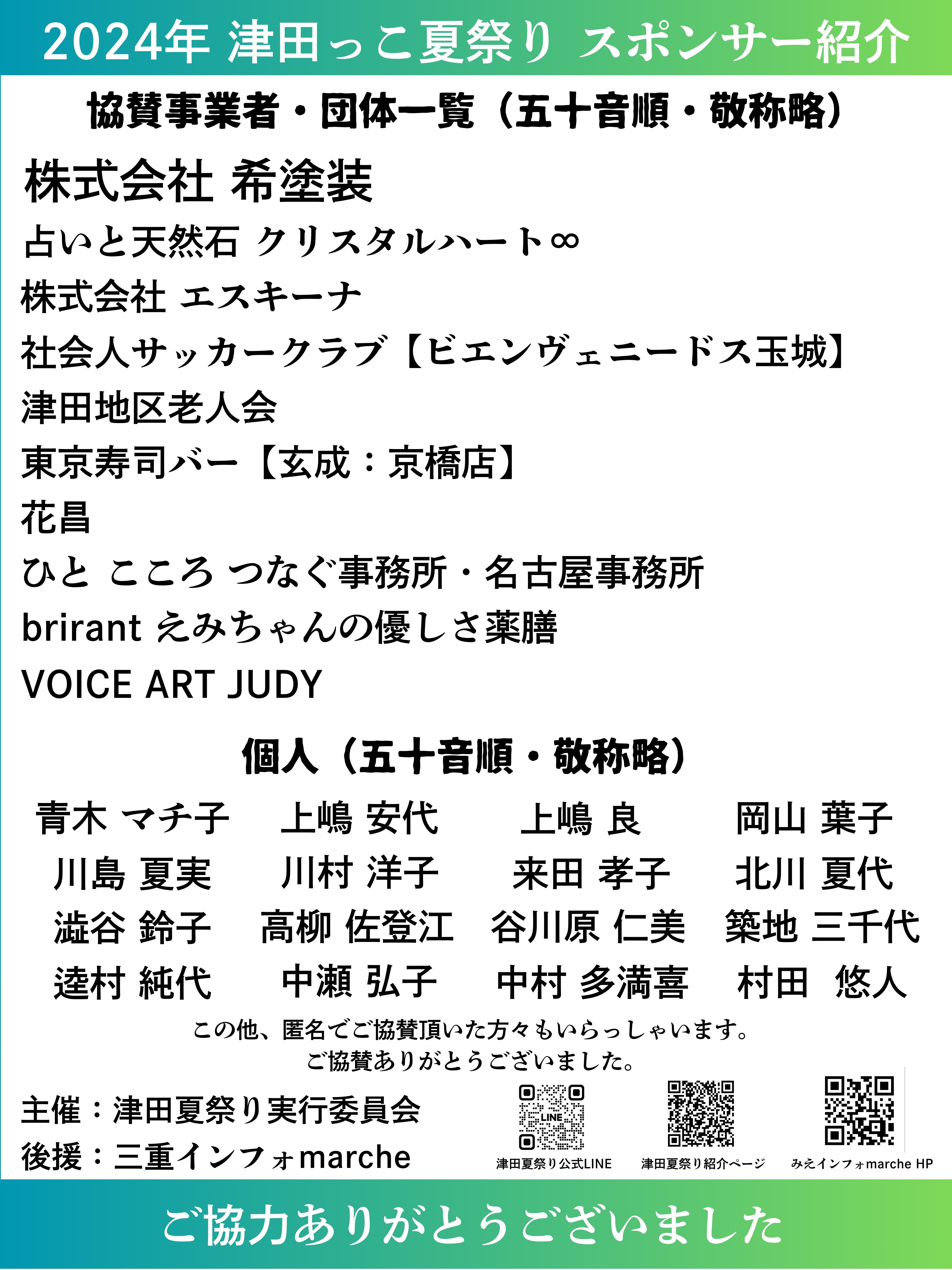 当日は、ぜひ夏祭り会場へ足を運んで頂いて、みんなで津田っこ夏祭りを楽しみましょう!