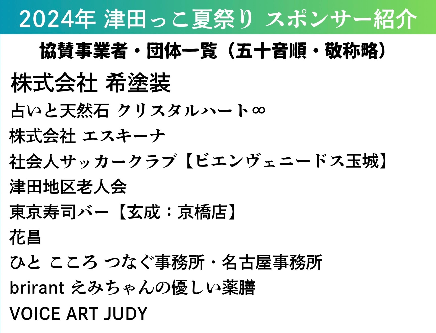 ・津田っこ夏祭り会場の挨拶時においてスポンサー者様(個人名、団体名、社名)を掲載し、お名前を読み上げいたします。