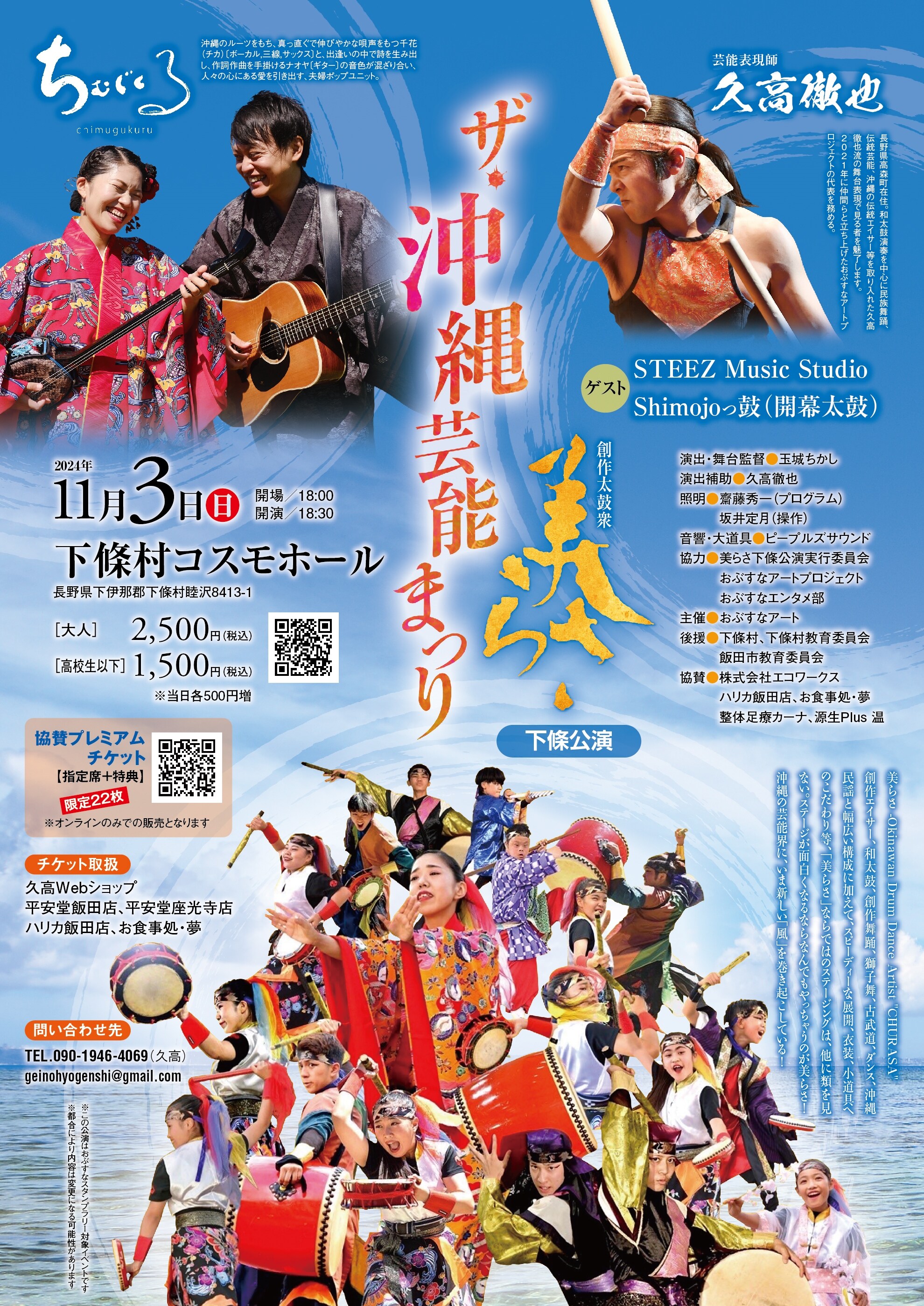 今年は美らさの大ファンでもあり、美らさへ楽曲提供、美らさを起用したミュージックビデオ発表等もしている夫婦ユニット「ちむぐくる」のお二人も出演されます。さらに、昨年も南信州・飯田の底力を見せつけてくれた実力派ダンススタジオ「STEEZ Music Studio」、そして地元下條村の和太鼓チーム「Shimojoっ鼓」が今年も舞台に上がります!