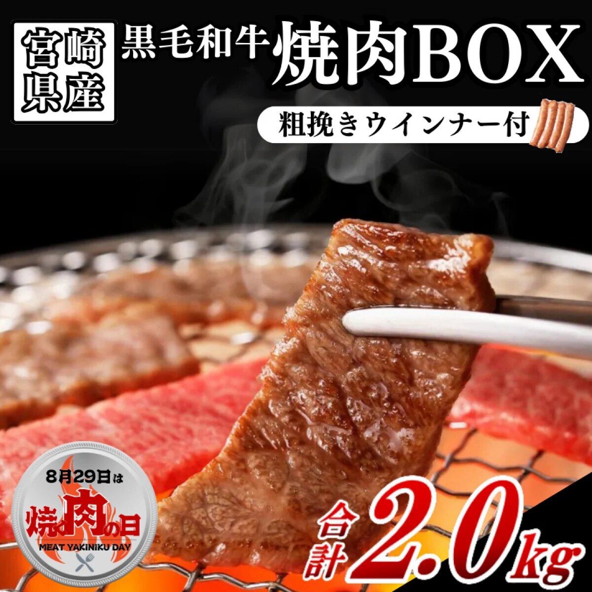 ①【焼肉の日】宮崎県産黒毛和牛焼肉BOX計2.0kg(粗挽きウィンナー付)【税込】8,929円 / 134ポイント付与