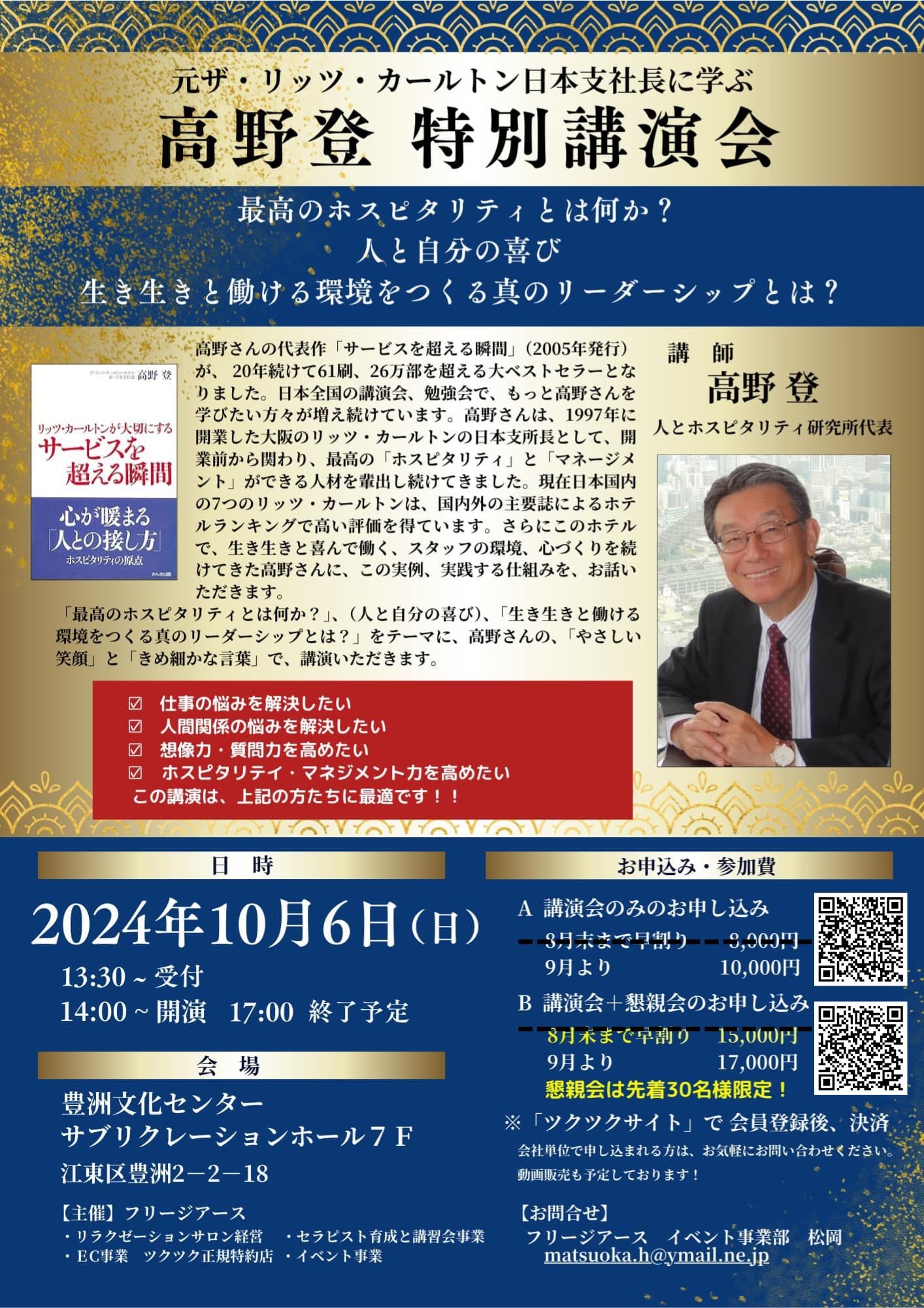 来月10月6日に豊洲で「ホスピタリティの伝道師」として著名な高野登さんの講演会があります。