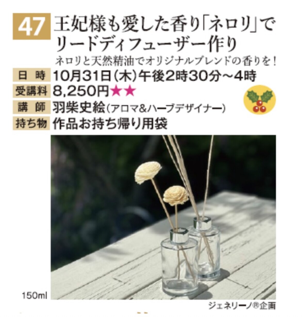 今回は特別に通常講座では使わない高価なネロリの精油も使えちゃう、とってもお得な講座です。