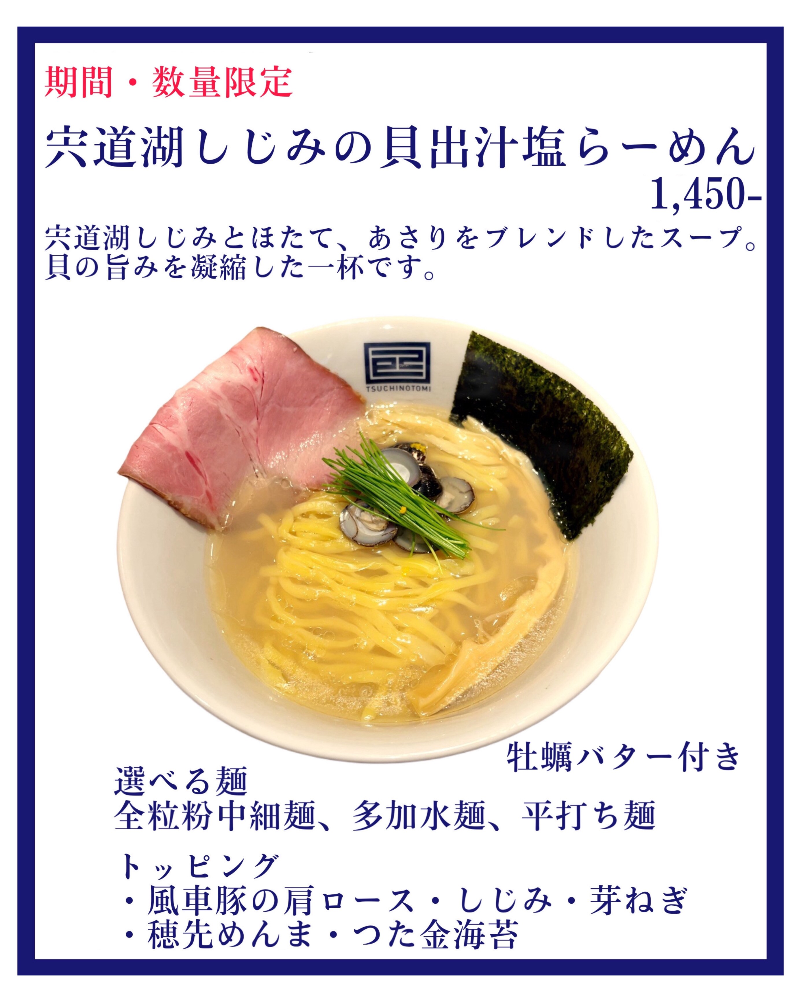 特別な味わいをお楽しみいただける、宍道湖のしじみ貝を贅沢に使用した塩らーめんが登場!✨しじみの旨味が凝縮された出汁が、あっさりとした塩味と絶妙に絡み合い、一口ごとに海の恵みを感じられます🌊。さらに、牡蠣バターを加えることで、コクと深みが加わり、よりリッチな風味をお楽しみいただけます🧈期間限定、数量限定となっておりますので、この機会をお見逃しなく!⏳貝出汁の優しい味わいが、心を癒してくれます❤️