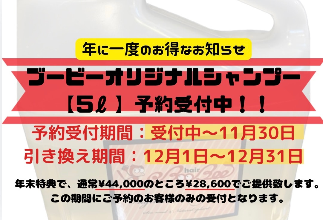 毎年ご好評頂いておりますオリジナルシャンプー(5リットル)のご予約が本日から開始致します。