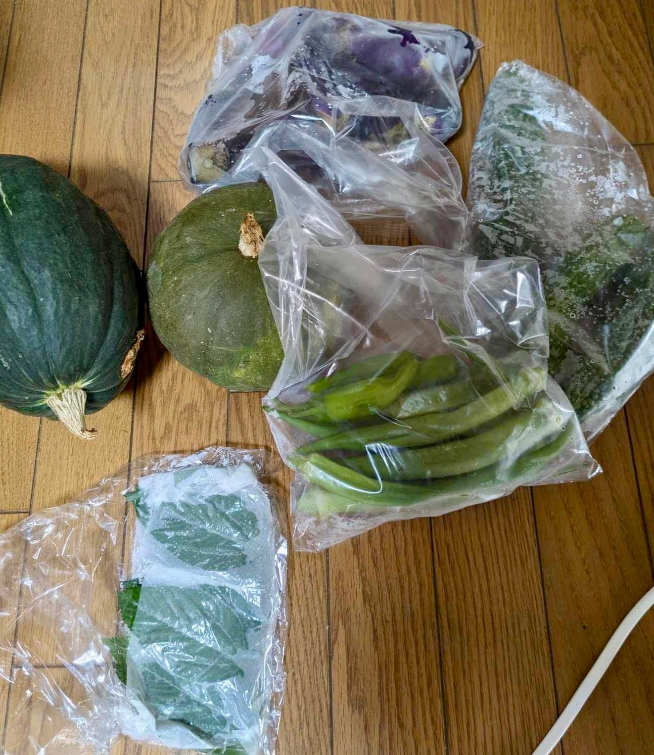 今月もご提供くださいました。かぼちゃ、ナス、ゴーヤ、唐辛子、オクラ、モロヘイヤ。