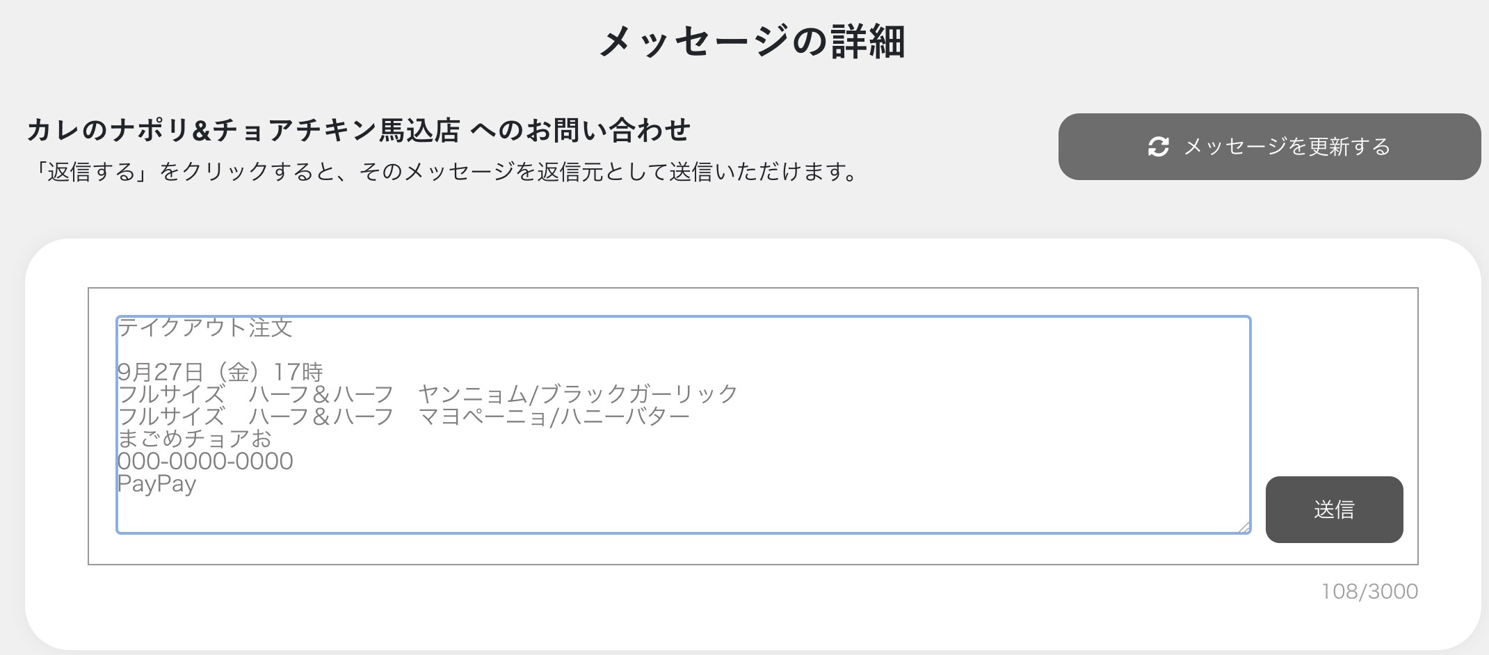 チョアチキン馬込店にメッセージが送れる画面になります。