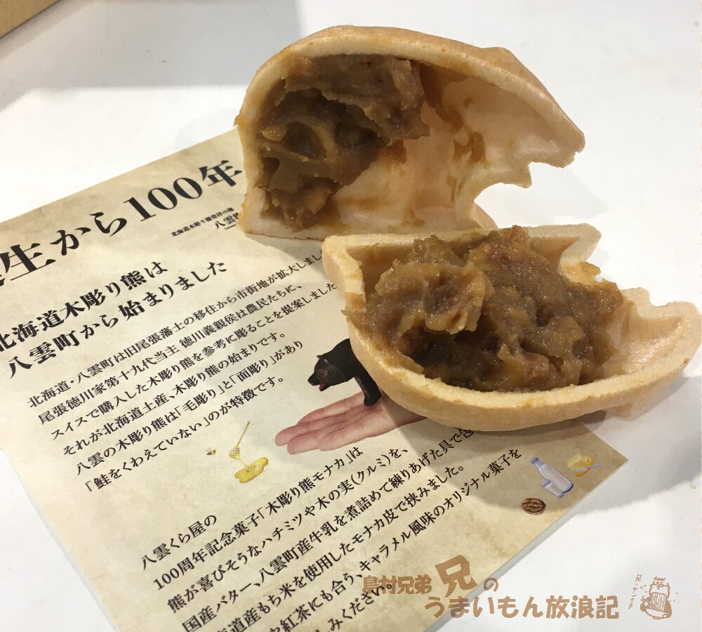 木彫りの熊モナカには、キャラメリゼされたクルミハニーバターが入っています。今風ですね!