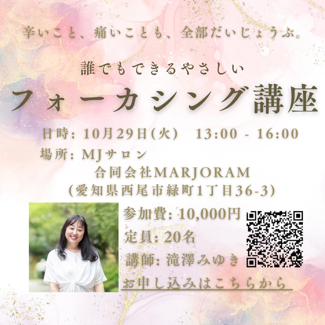 愛知県西尾にあるMJサロン様からご要望いただき、フォーカシングについてお話させていただきます。
