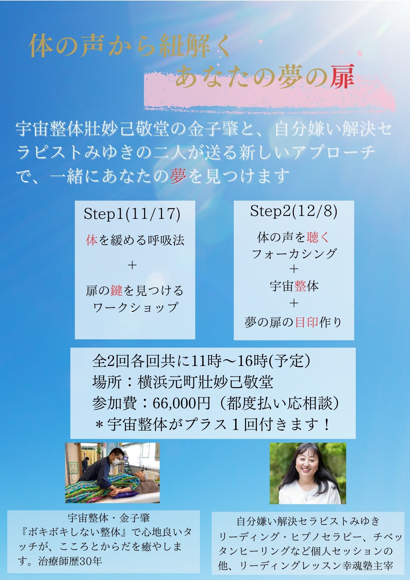 そこで、二回にわたり、体の声を聞きながらご自身の夢を見つけ、そのための目印も作っていただきます。もちろん、宇宙整体も二回分付いているお得なコラボです。