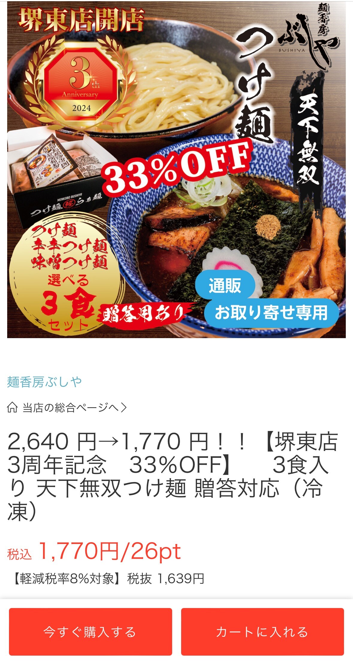 例として【つけ麺3食入り】をご購入いただいた場合は通常2,640円→1,770円で870円お得になり、送料を入れても定価よりもお安くなっております👏