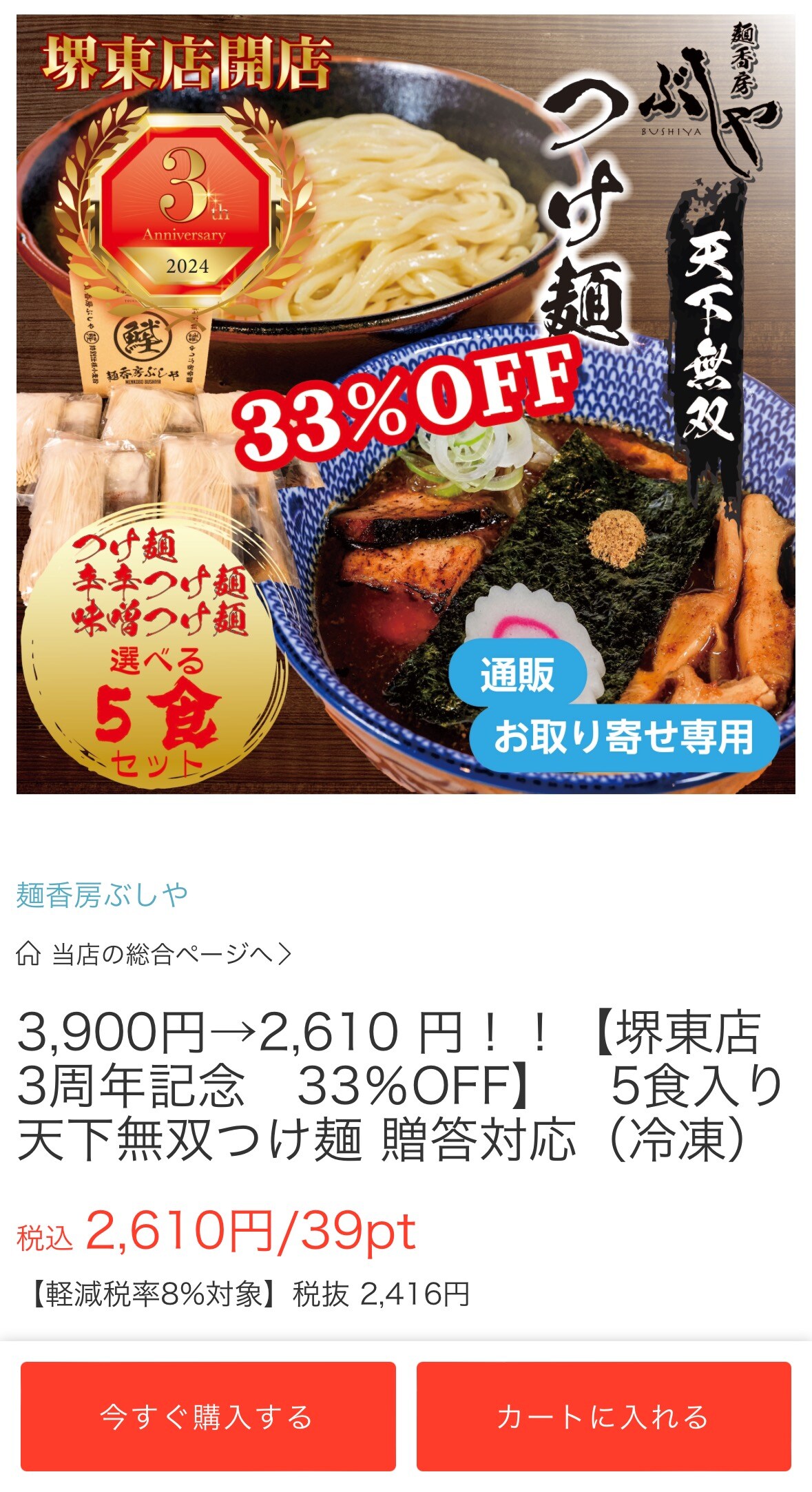【つけ麺5食入り】の場合では通常3,900円→2,610円で、なんと!1,290円も安く購入できちゃいます🥳