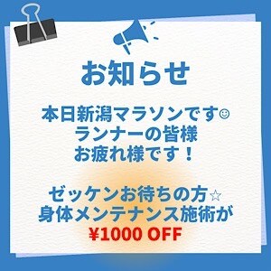ランナーの方でゼッケンをお持ちの方は施術を1000円OFFにさせていただきます✨