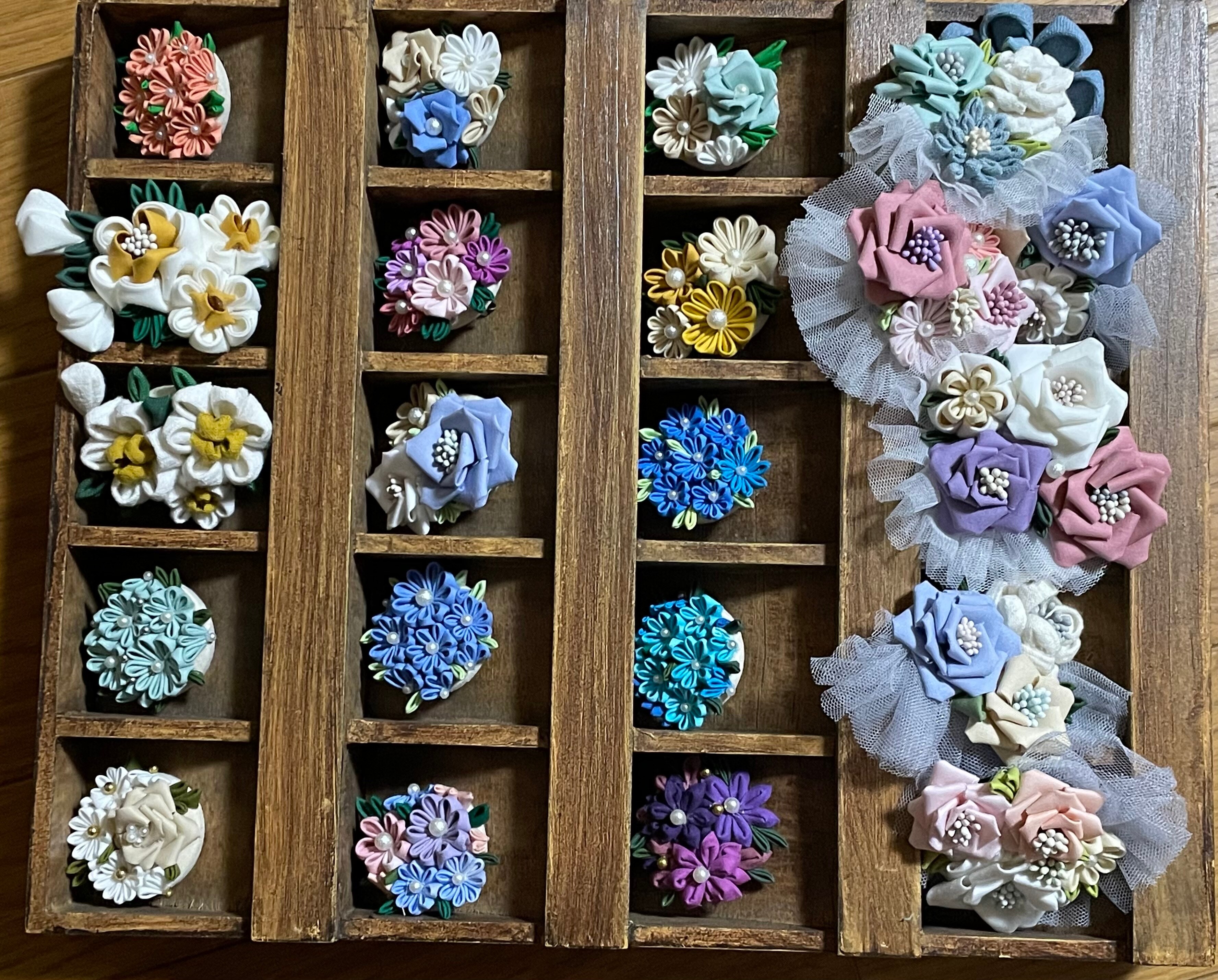 布の花びらを1つ1つ折って作るつまみ細工を普段ようにアイテムに。