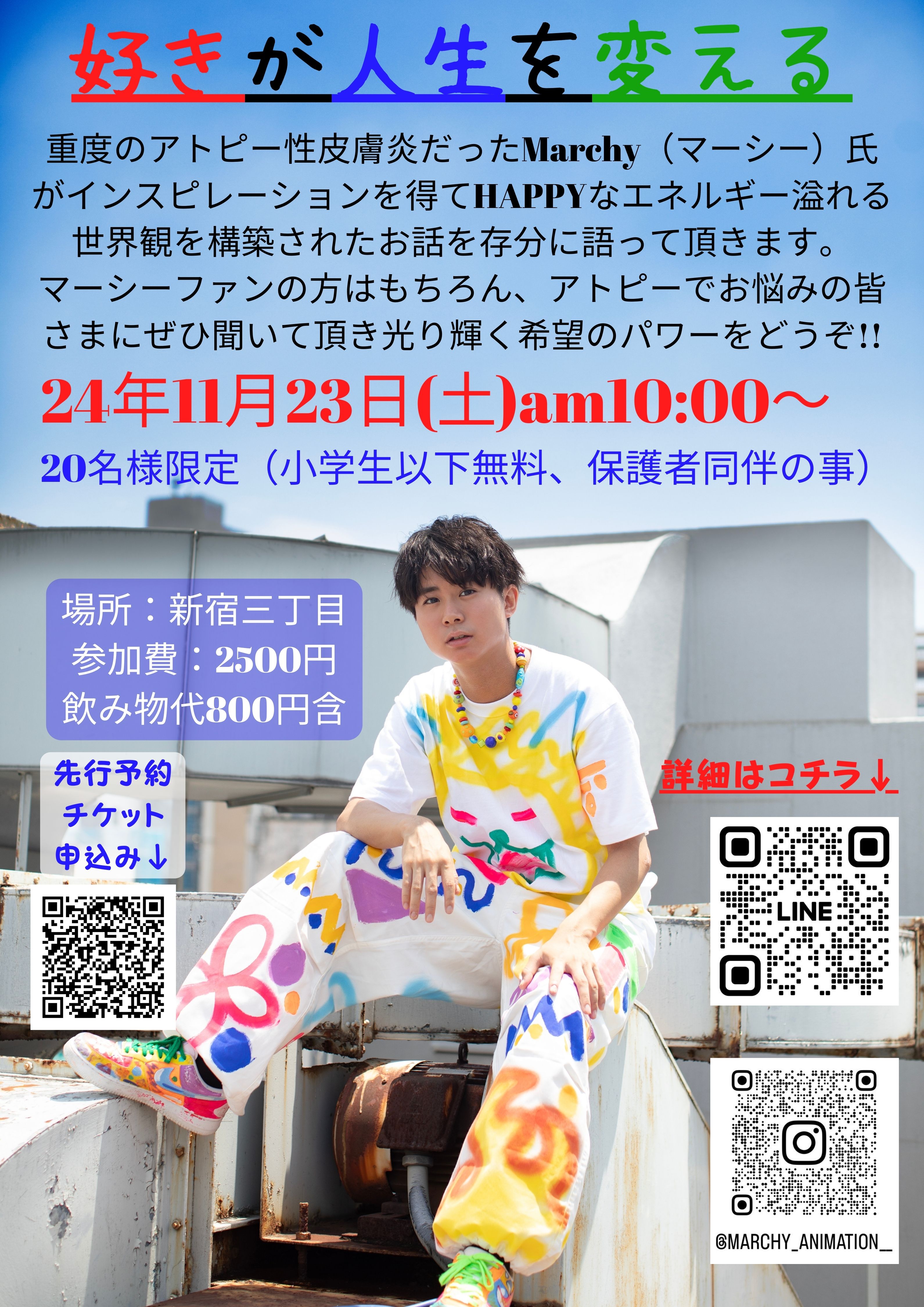 明日10月21日(月)桜庭大王様主催、東京ドームシティでのビッグイベントにも出店され舞台でもご挨拶される個性派デザイナーのMarchy(マーシー)から、ご自身が長年悩んでおられたアトピー性皮膚炎を克服されたお話しを直接お聴きできる、20名限定の講演会を主催させて頂ける事になりました。