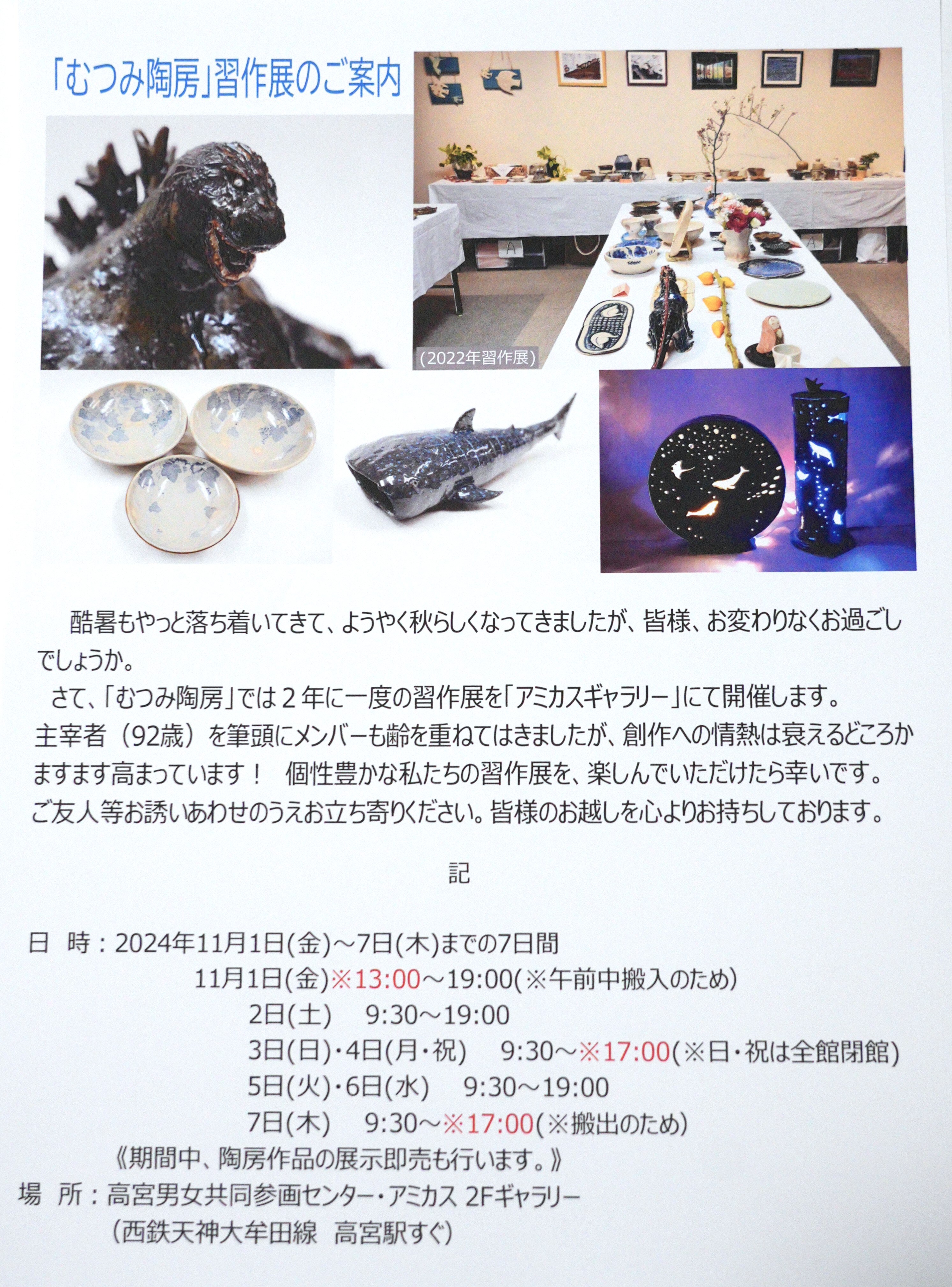 「むつみ陶房」の第17回習作展を別添資料のとおり開催します。会員さんの創作意欲は健在です。今回も楽しい作品が揃っています。ご覧いただければ幸いです。期間中は陶房の展示即売も行いますので、ご友人等お誘いあわせのうえお立ち寄りください。皆様のお越しを心よりお待ちしております。なお、開催時間が日によって少し異なりますのでご注意願います。詳細は資料にて確認をお願いします。