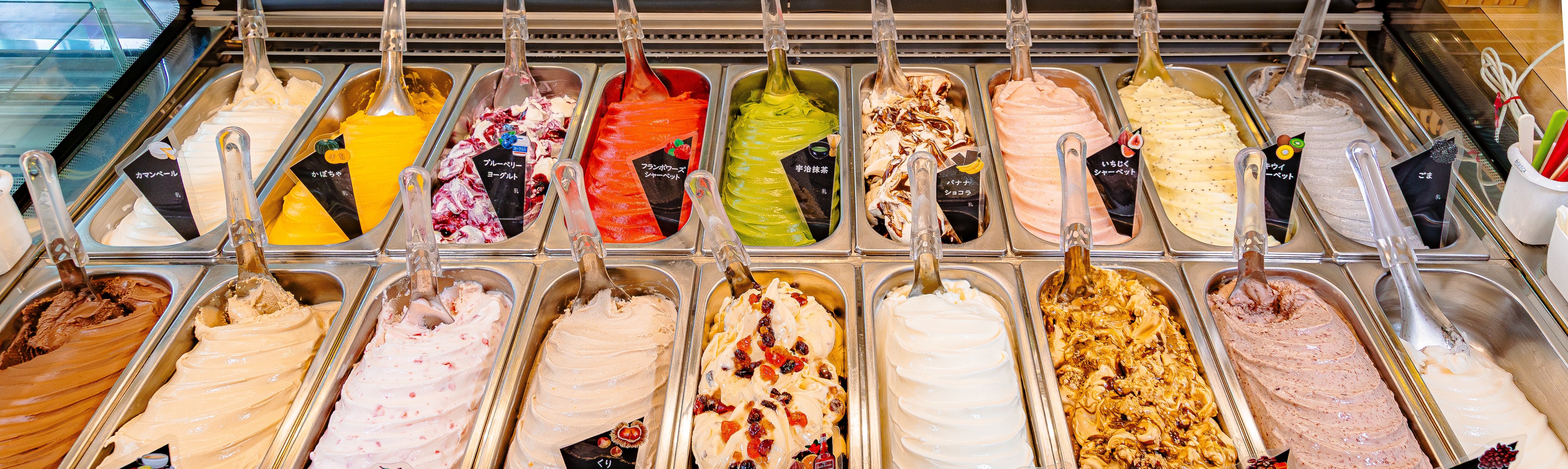 ソレイムさんに入店ると常時18種類のジェラートがショウケースに並んでいて何を食べていいか迷ってしまいます。
