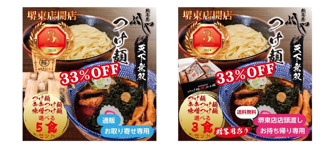 ぶしや堺東店が10月で開店3周年を記念して、つけ麺の通販が33%OFFで買えます!!