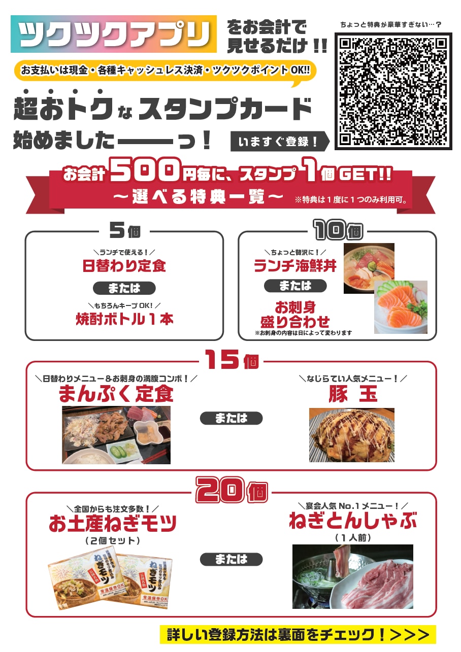 ちなみにですが、例えば5,000円の宴会コースを10名でご予約いただいた宴会幹事さん、お会計の時にツクツクアプリを提示いただくといくつスタンプが付くかは…ぜひ計算してみてください。