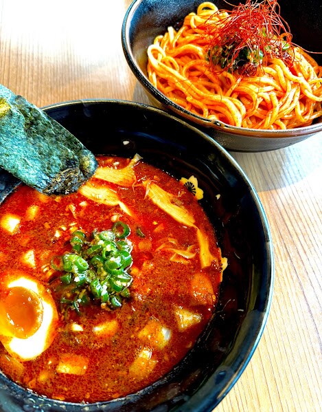 つけ麺の“麺”は自家製赤唐辛子オイル&青唐辛子オイル、さらに朝鮮唐辛子で合えた真っ赤な麺に仕上げております😳