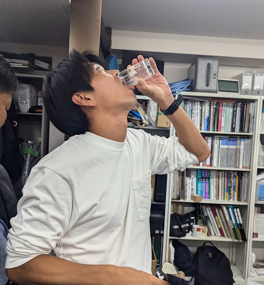 外装担当・竹内に試飲してもらいました!手つきが慣れています!