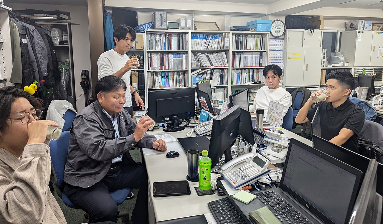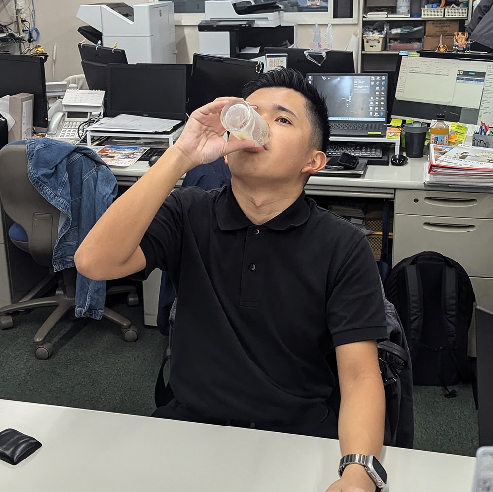 午後のひと時、社内でデスクワーク中の営業スタッフにも試飲してもらいました。