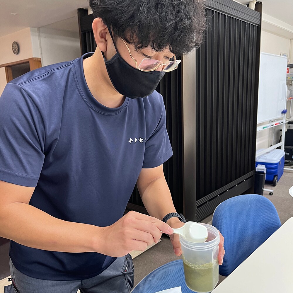 ▲「お、いつものプロテインとは違う味だな・・・」と言いながらも、底に溜まってしまったプロテインに水を追加、最後の一滴までしっかり飲み干しました!