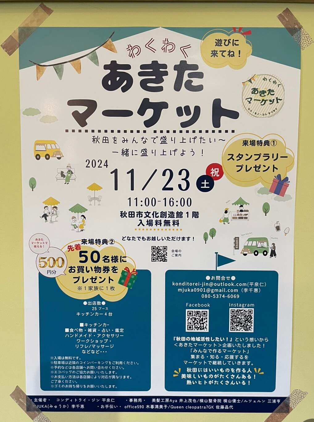 ① 11月23日(木)11時〜16時、秋田市文化創造館で【わくわく秋田マーケット】が開催されます!