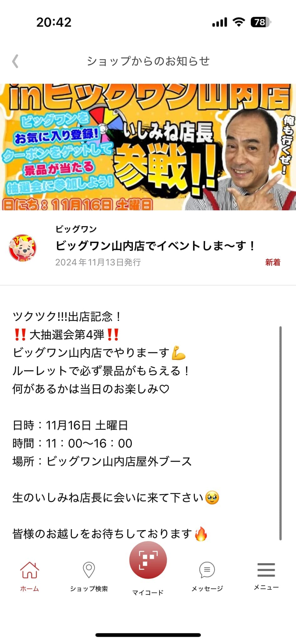 ① ツクツク!!!アプリの「ショップ検索」→ 「ビッグワン」をお気に入り追加 → お気に入りクーポンの提示