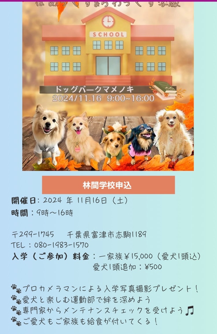 開催地は千葉県富津市にあり、紅葉が色づき始めた「もみじロード」沿いにある「マメノキドッグパーク」。森に囲まれ、手入れされた芝生も綺麗な、食事(人用も犬用もあります)も美味しい、スタッフさんも明るいお勧め施設です。