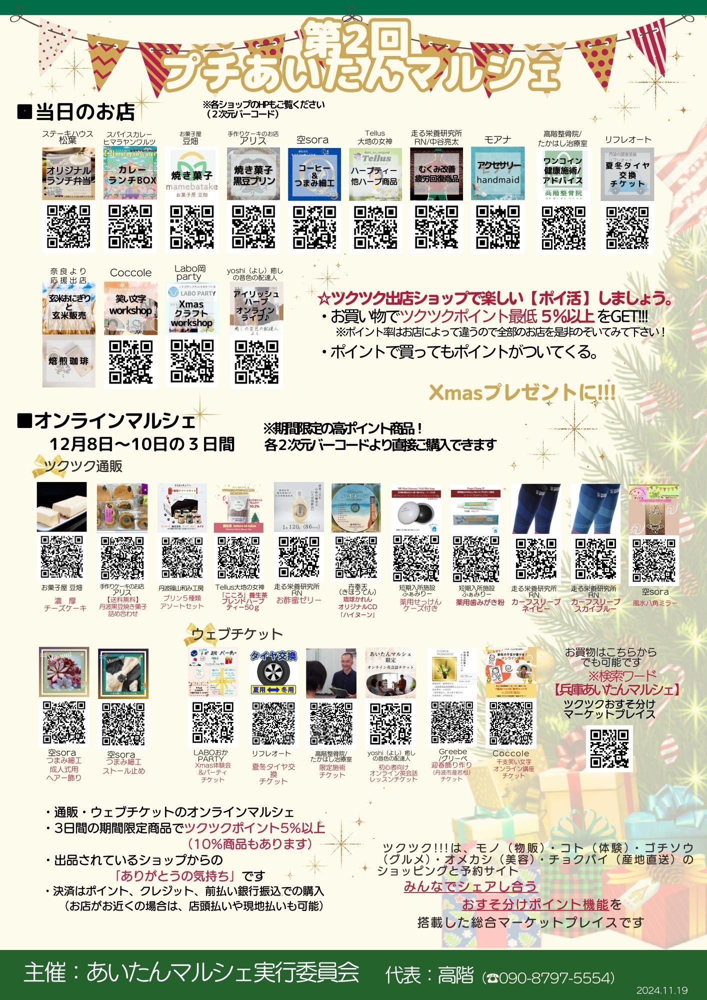 ■ツクツクオンラインマルシェも同時開催!!! 12月8日〜10日まで期間限定マルシェで通販やウェブチケットなどオンラインマルシェだけの期間限定高ポイント商品がご案内のマルシェチラシ裏面に商品やウェブチケットの2次元バーコードが記載されています。読み取りで詳細確認や直接ご購入が出来ます。