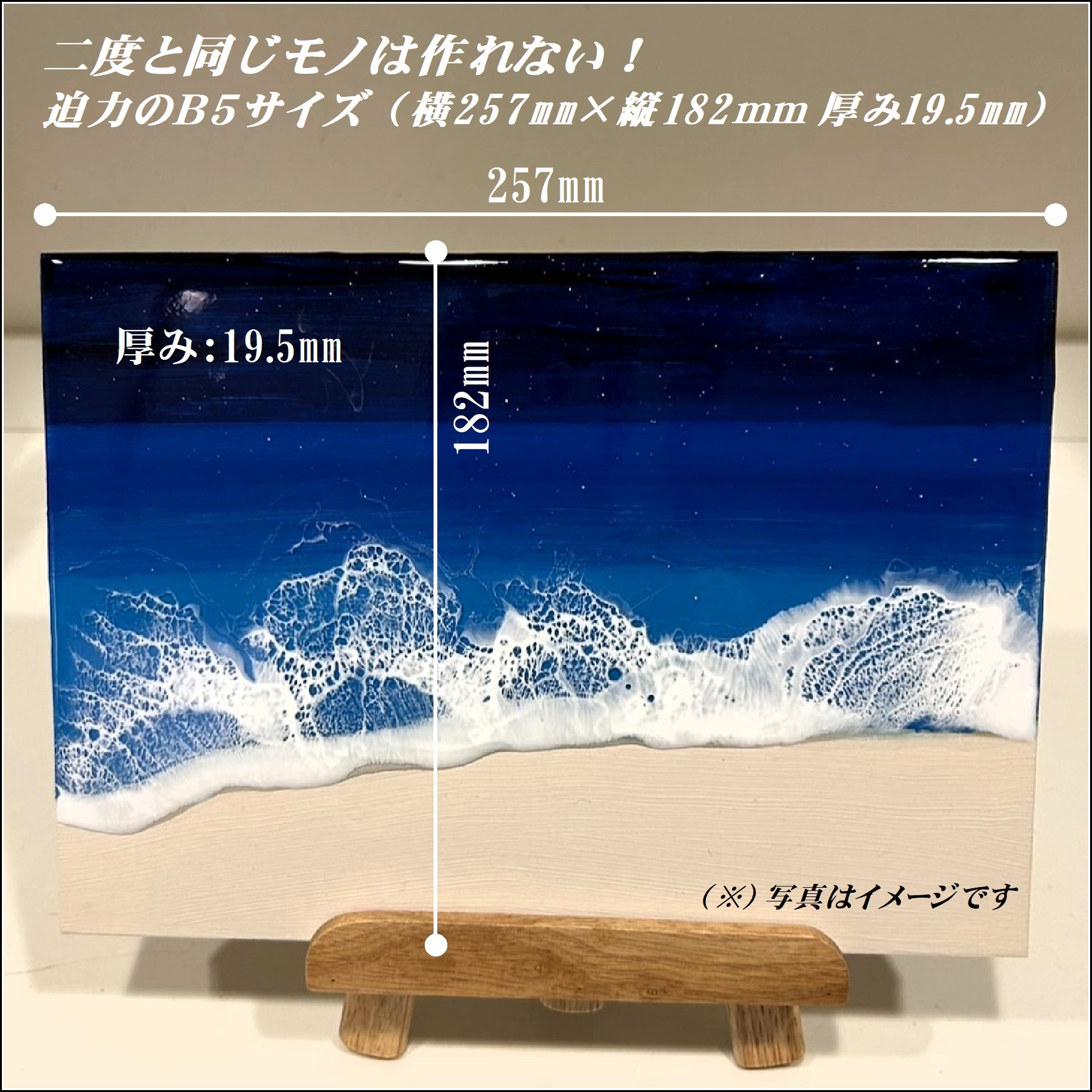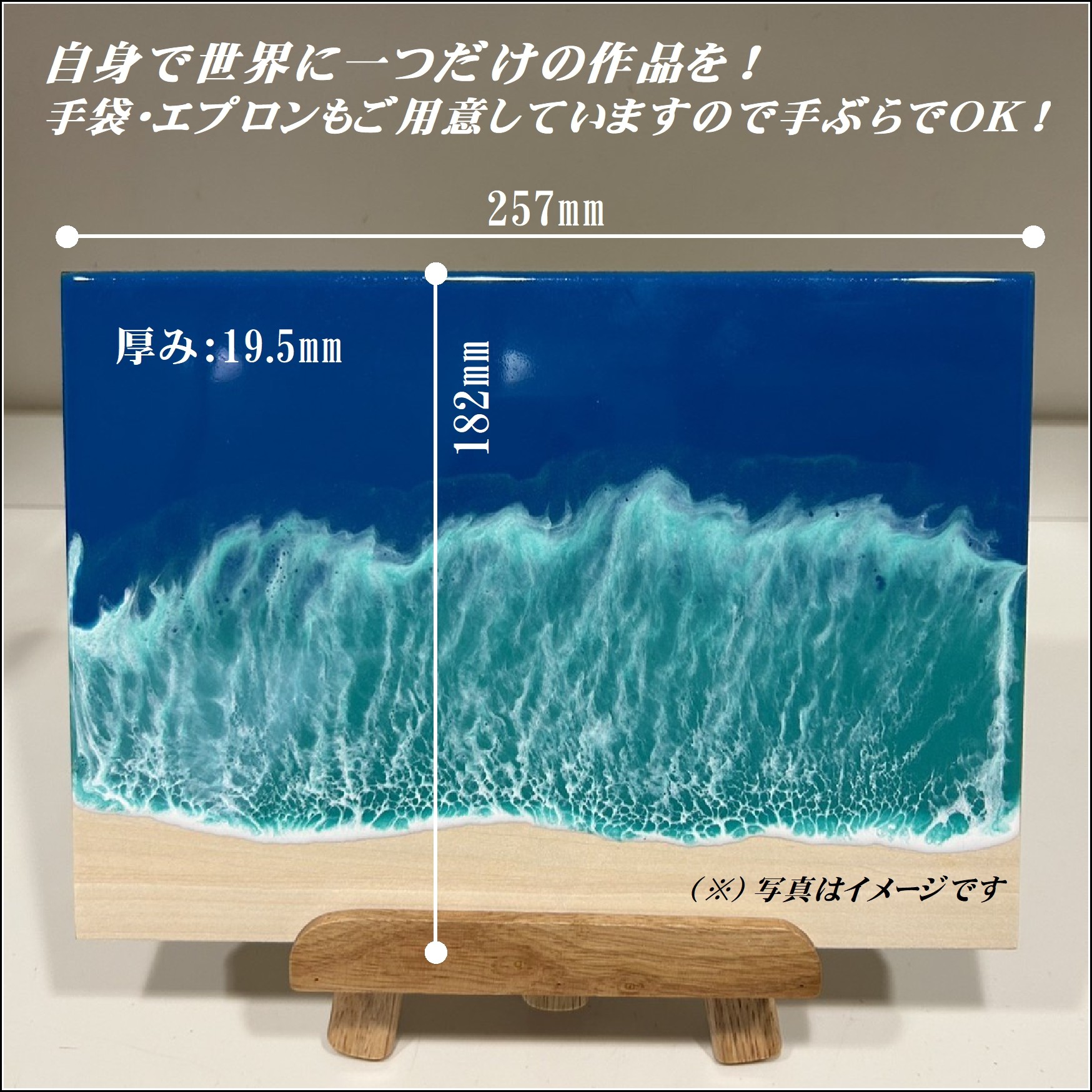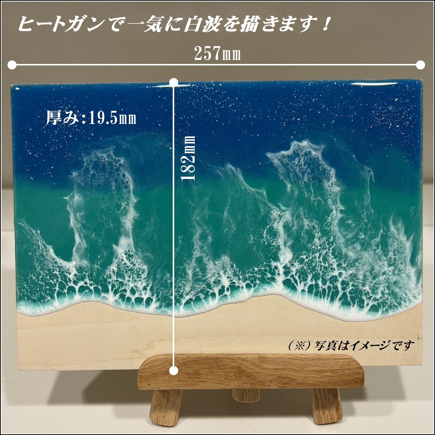絵具で海を描き、樹脂を流します。白波の顔料を乗せたらヒートガンで一気に波を描きます。二度と同じモノは作れません。