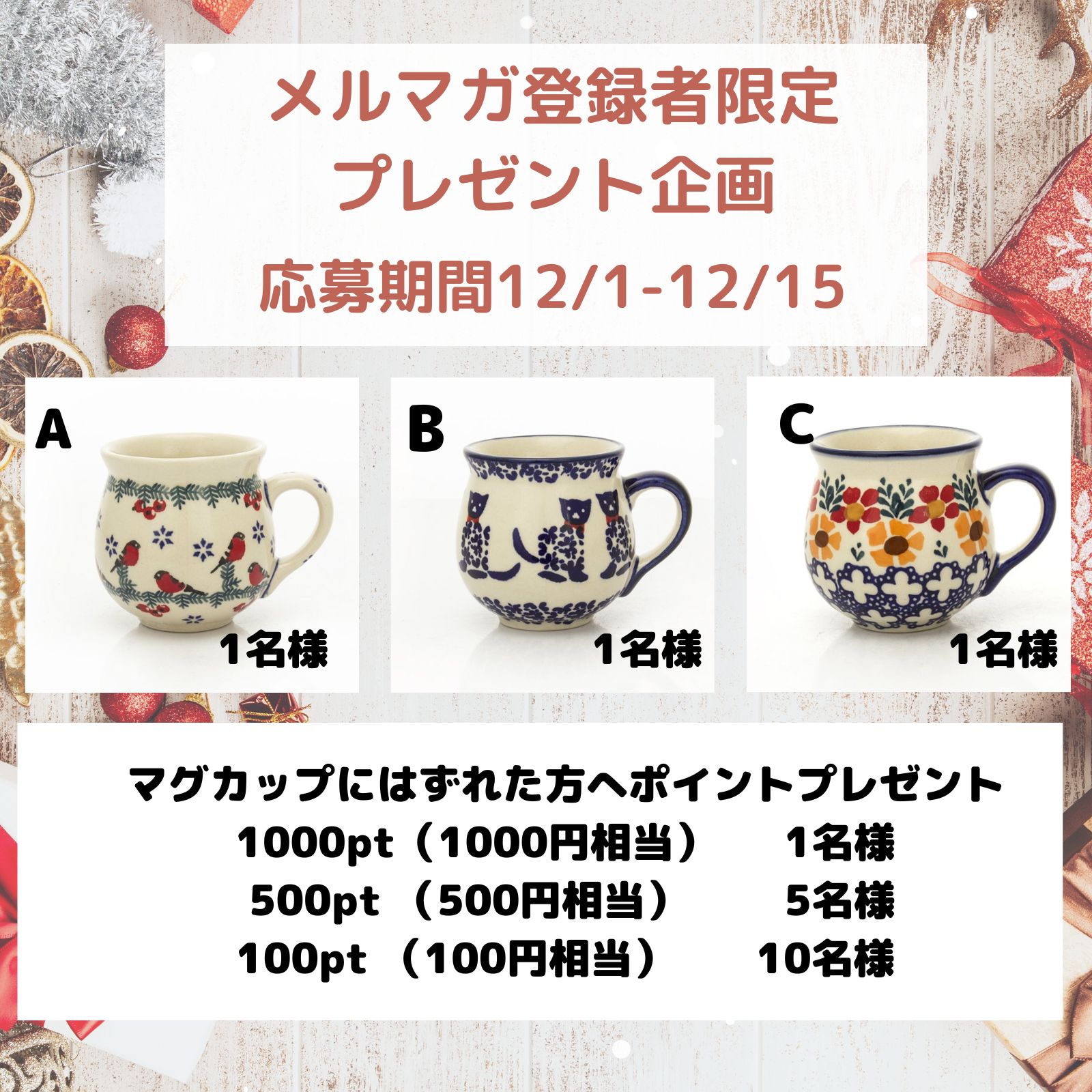 昨日メルマガでお知らせした通り、メルマガ登録者限定のクリスマスプレゼント企画を実施します。今回ポーランド食器のマグカップが抽選で3名様に当たります。