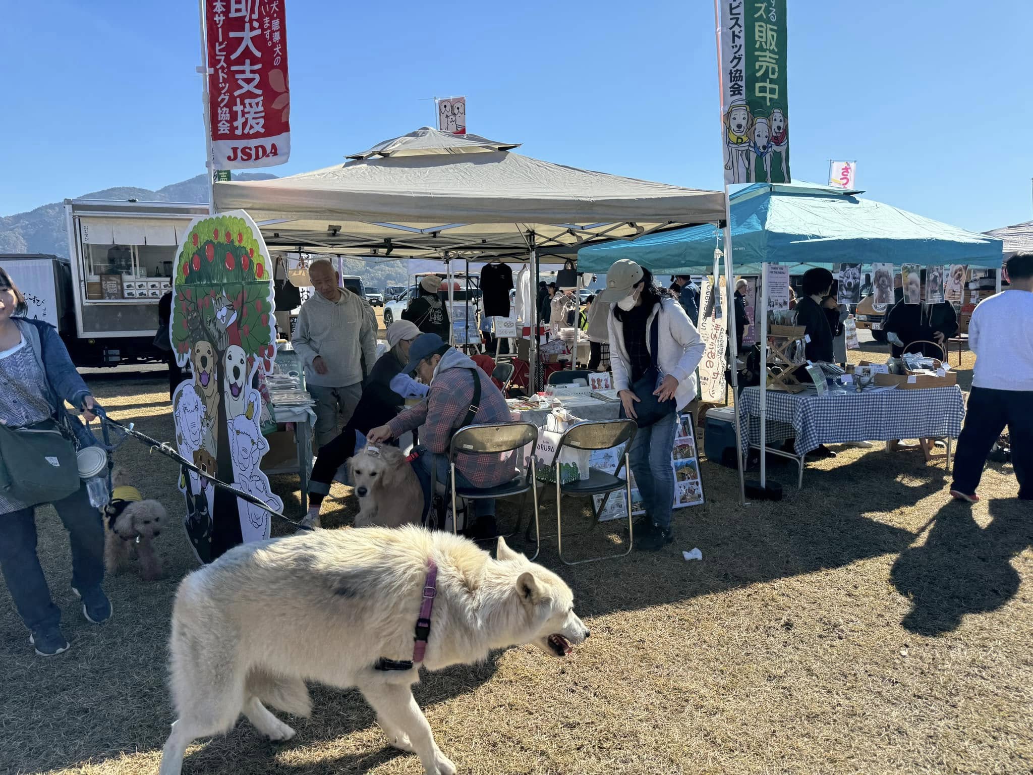 温かい日差しの中、出店者同士、出店者とお客様、人とわんちゃん、ワンちゃん同士、
