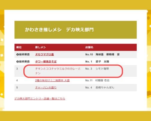 先日、かわさき推しメシの一次投票の結果発表がありました。
